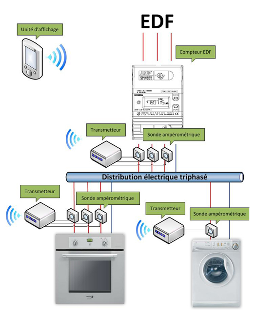 Le produit est constitué de capteurs de courant, de transmetteurs et d'une unité d'affichage. Le capteur de courant est une pince ampérmétrique. Le transmetteur communique avec l'unité d'affichage grâce à une liaison sans fils.